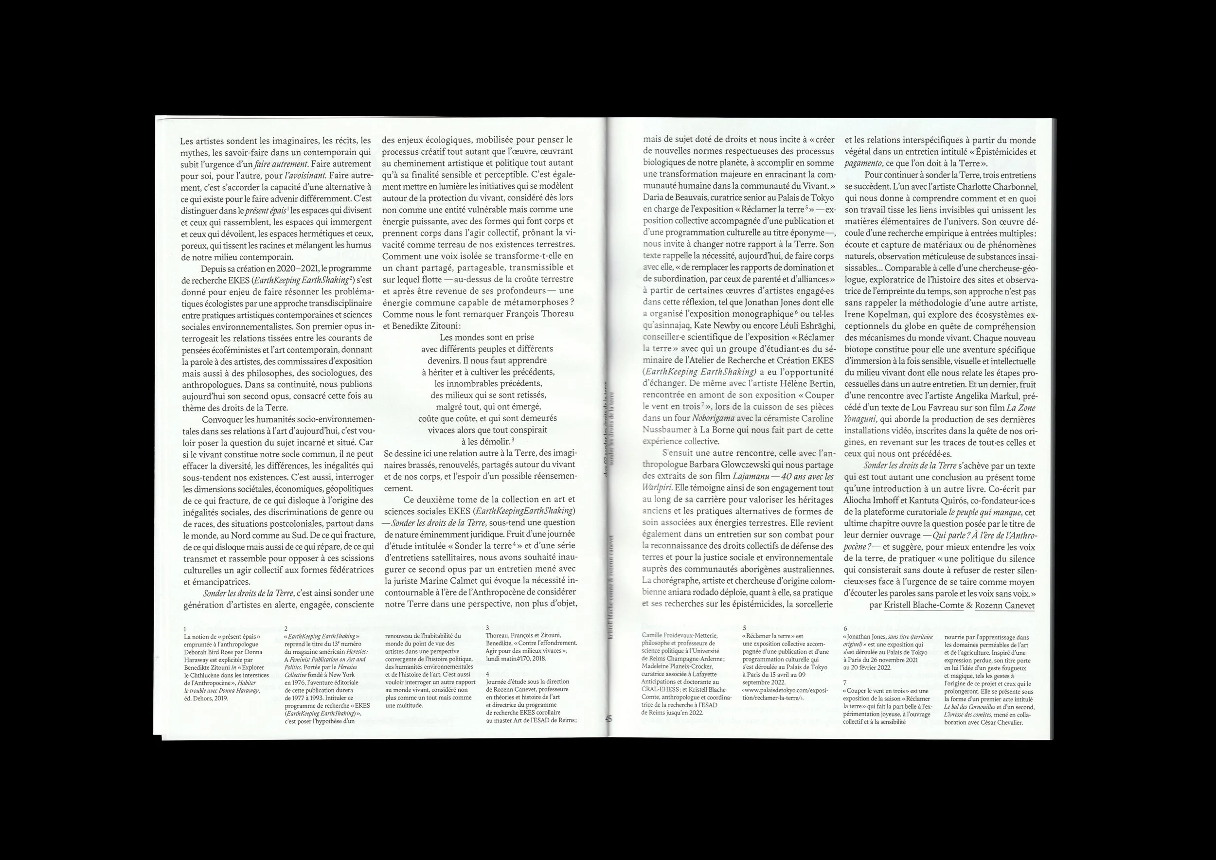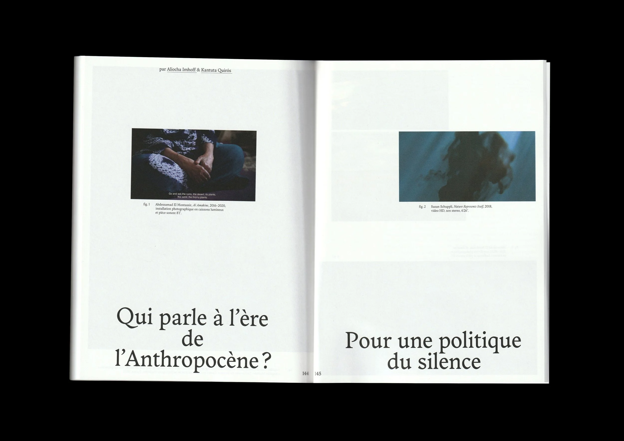 EKES – «Sonder les droits de la Terre» s’achève par un texte qui est tout autant une conclusion au présent tome qu’une introduction à un autre livre. Co-écrit par Aliocha Imhoff et Kantuta Quirós, co-fondateurices de la plateforme curatoriale le peuple qui manque, cet ultime chapitre ouvre la question posée par le titre de leur dernier ouvrage —Qui parle ? À l'ère de l'Anthropocène ?— et suggère, pour mieux entendre les voix de la Terre, de pratiquer «une politique du silence qui consisterait sans doute à refuser de rester silencieux·ses face à l’urgence de se taire comme moyen d’écouter les paroles sans parole et les voix sans voix.»