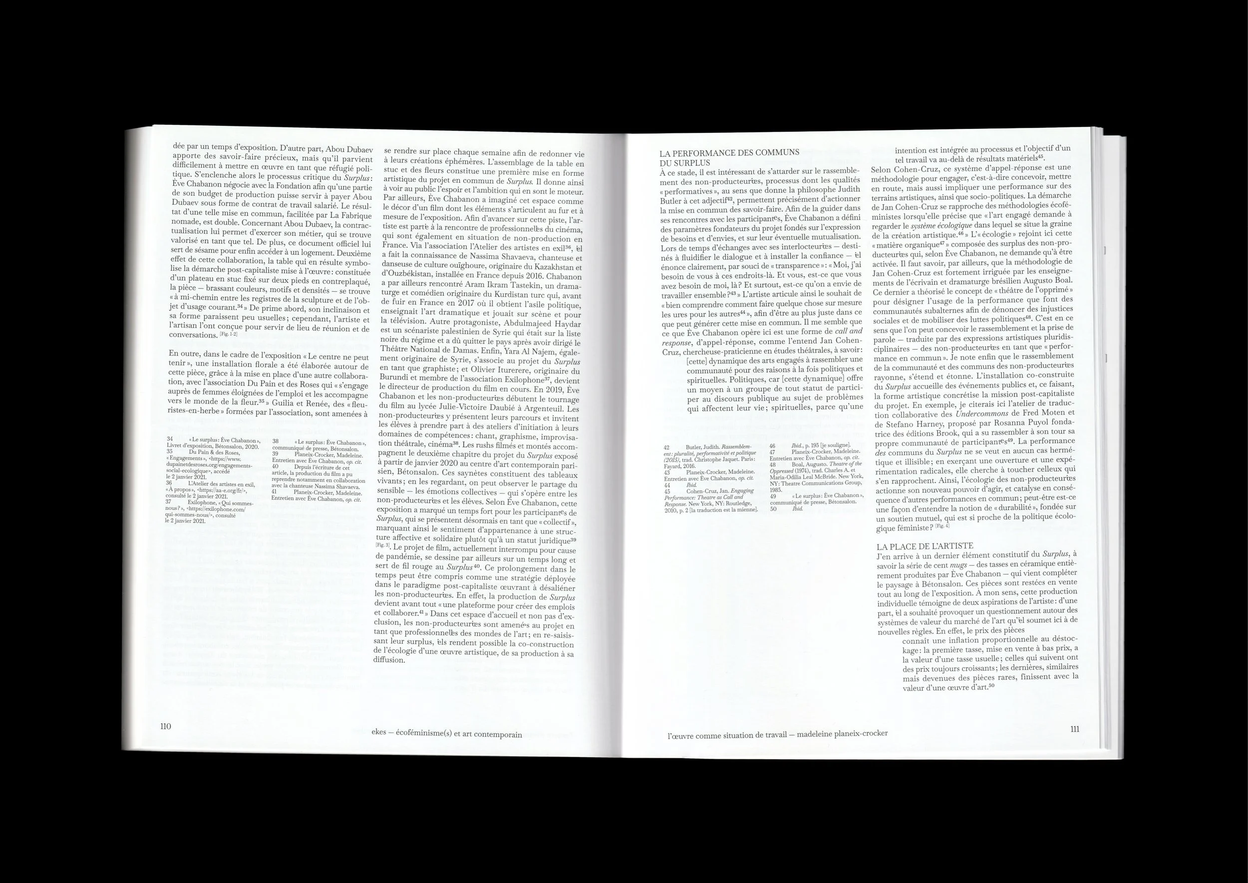 La chercheuse-curatrice Madeleine Planeix-Crocker ouvre à une problématisation des approches écoféministes en regard de la performance de l’artiste Ève Chabanon, «Le surplus du non-producteur», relevant ses potentiels critiques et interrogeant, ce faisant, la possibilité d’un nouveau paradigme post-capitaliste à l’aune des communs. Sans chercher à catégoriser le travail d’Ève Chabanon d’« écoféministe » à proprement parler, Madeleine Planeix-Crocker recourt aux outils (pratiques, concepts, enseignements), partagés par les écoféministes, en tant que prisme d’analyse de ce projet hyper-contemporain qu’est Le surplus.