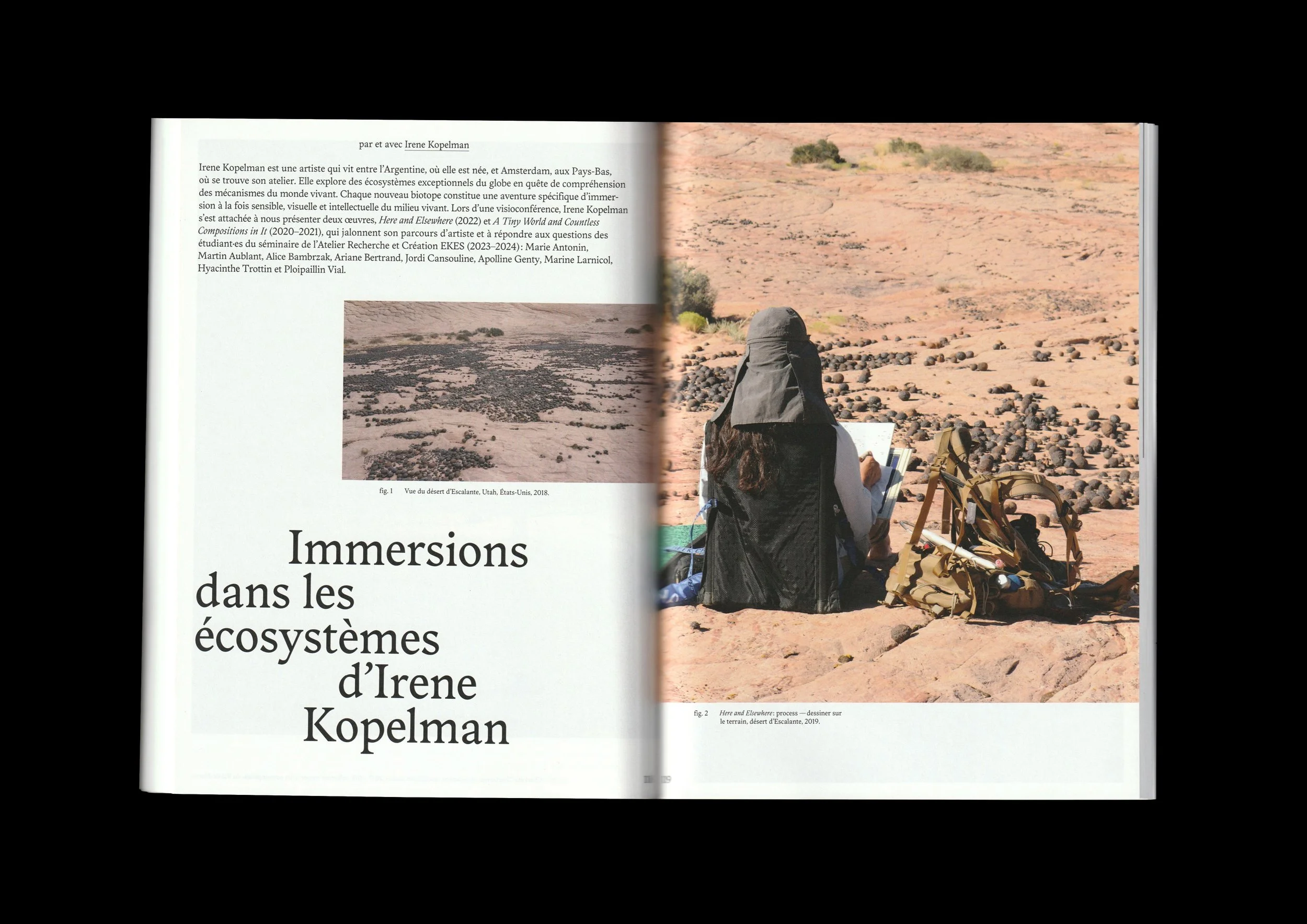 Lors d’une visioconférence, Irene Kopelman s’est attachée, dans un premier temps, à nous présenter deux œuvres, Here and Elsewhere (2022) et A Tiny World and Countless Compositions in It (2020-2021). Dans un second temps, elle répond aux questions des étudiant·es du séminaire de l’Atelier Recherche et Création EKES (2023-2024) pour relater les étapes processuelles de sa pratique et son parcours d’artiste.