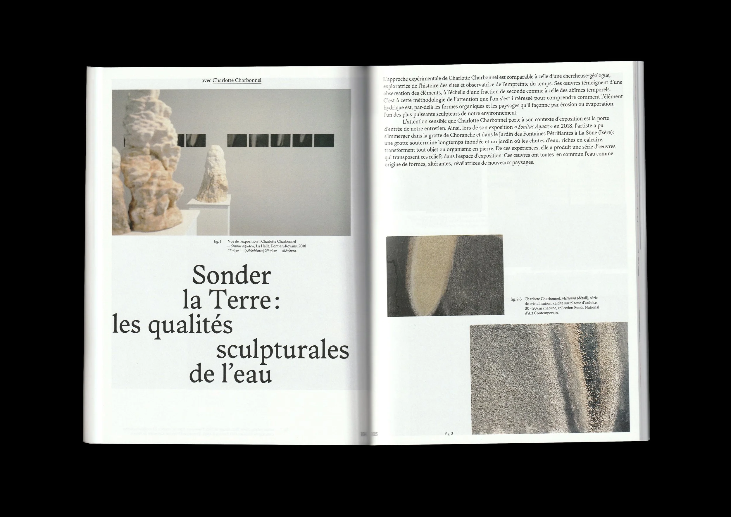 L’approche expérimentale de Charlotte Charbonnel est comparable à celle d’une chercheuse-géologue, exploratrice de l’histoire des sites et observatrice de l’empreinte du temps. Ses œuvres témoignent d’une observation des éléments, à l’échelle d’une fraction de seconde comme à celle des abîmes temporels. C’est à cette méthodologie de l’attention que l’on s’est intéressé pour comprendre comment l’élément hydrique est, par-delà les formes organiques et les paysages qu’il façonne par érosion ou évaporation, l’un des plus puissants sculpteurs de notre environnement. L’attention sensible que Charlotte Charbonnel porte à son contexte d’exposition est la porte d’entrée de cet entretien. Ainsi, lors de son exposition «Sonitus Aquae» en 2018, l’artiste a pu s’immerger dans la grotte de Choranche et dans le Jardin des Fontaines Pétrifiantes à La Sône (Isère) : une grotte souterraine longtemps inondée et un jardin où les chutes d’eau, riches en calcaire, transforment tout objet ou organisme en pierre. De ces expériences, elle a produit une série d’œuvres qui transposent ces reliefs dans l’espace d’exposition. Ces œuvres ont toutes en commun l’eau comme origine de formes, altérantes, révélatrices de nouveaux paysages.